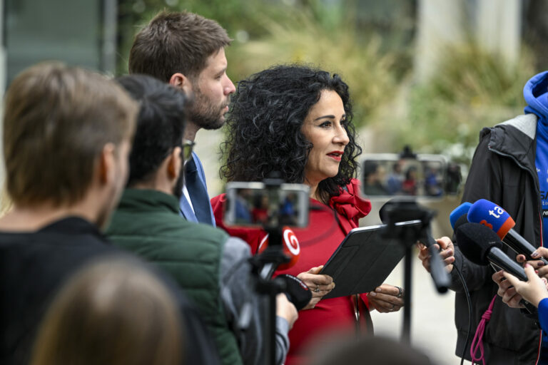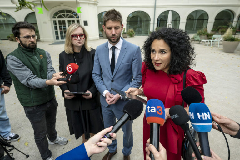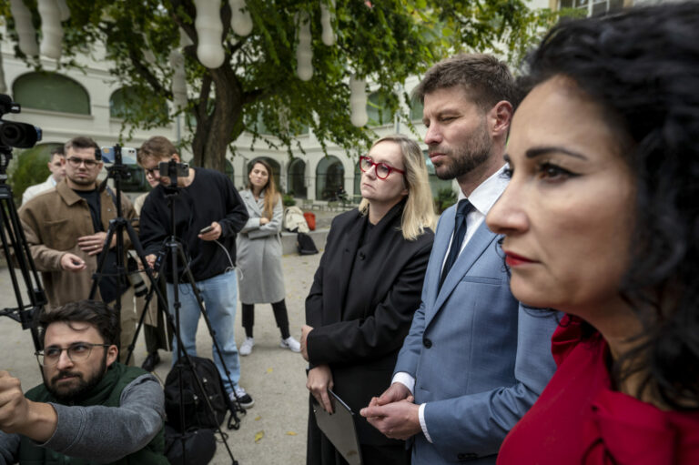 Sprava: Podpredsedníčka PS a Výboru NR SR pre kultúru a médiá Zora Jaurová, predseda PS Michal Šimečka a poslankyňa NR SR Dana Kleinert počas brífingu hnutia Progresívne Slovensko (PS) k poslaneckým prieskumom v Slovenskom národnom divadle (SND) a Slovenskej národnej galérii (SNG) pred budovou SNG v Bratislave. Bratislava, 16. október 2024. Foto: SITA/Milan Illík