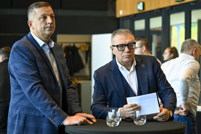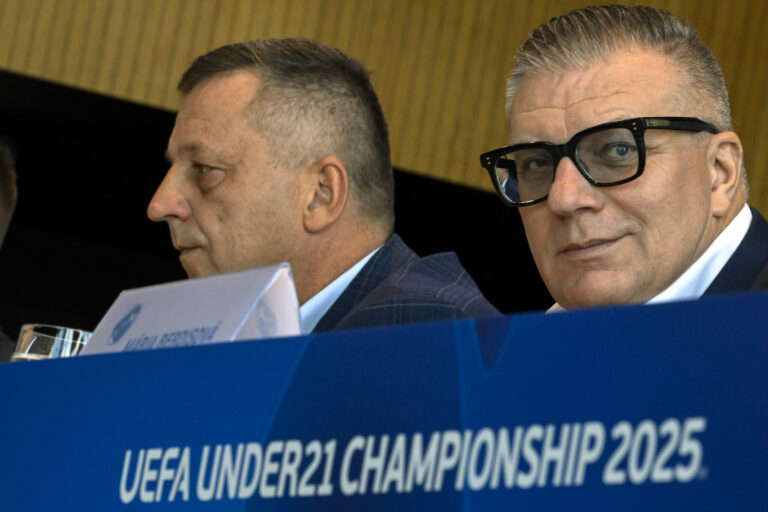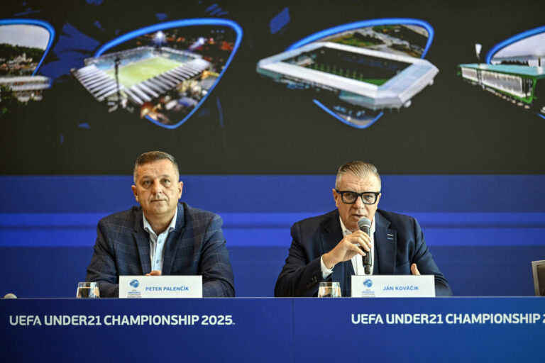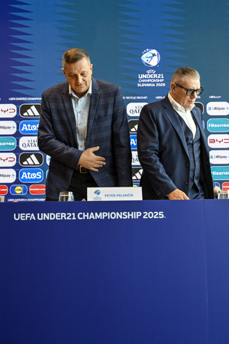 Sprava: Prezident SFZ Ján Kováčik a generálny sekretár SFZ Peter Palenčík počas tlačovej konferencie Slovenského futbalového zväzu (SFZ) k 25. majstrovstvám Európy ME 2025 vo futbale hráčov do 21 rokov (U21), ktoré sa uskutočnia v lete 2025 na Slovensku. Bratislava, 16. október 2024. Foto: SITA/Milan Illík