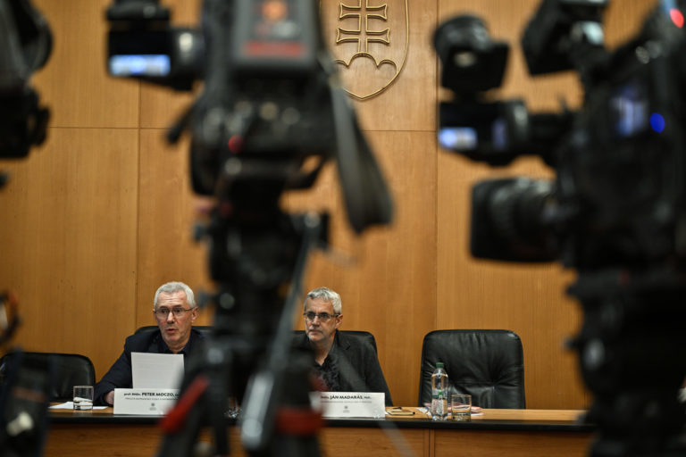 Zľava: Seizmológ UK a SAV Peter Moczo a generálny riaditeľ Ústavu vied o Zemi SAV Ján Madarás počas brífingu Univerzity Komenského (UK) a Ústavu vied o Zemi Slovenskej akadémie vied (UVZ SAV) na tému: Zemetrasenie, ktoré 9. októbra zasiahlo východné Slovensko. Foto: SITA/Milan Illík.