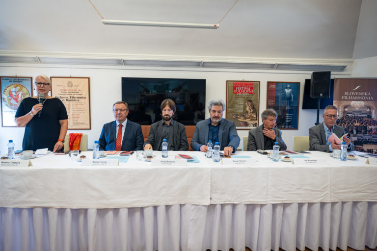 Zľava: Tlačová tajomníčka SF Martina Tolstova, generálny riaditeľ SF Marián Turner, dramaturg SF Juraj Bubnáš, šéfdirigent SF Daniel Raiskin, zbormajster SFZ Jan Rozehnal a riaditeľ pre technickú prevádzku SF Rudolf Novák počas tlačovej besedy Slovenskej filharmónie (SF) na tému: 75. koncertná sezóna Slovenskej filharmónie 2023/2024. Foto: SITA/Jana Birošová.