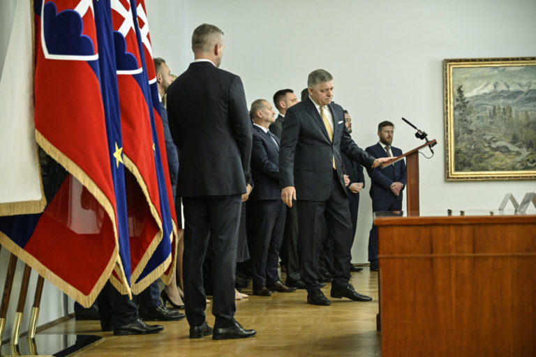 Predseda strany SMER-SSD Robert Fico (v popredí) po slávnostom akte podpísania Koaličnej zmluvy za účasti predsedu strany Smer - slovenská sociálna demokracia (SMER-SSD), predsedu strany Hlas - sociálna demokracia (Hlas-SD) a predsedu Slovenskej národnej strany (SNS) v Historickej budove Národnej rady SR. Foto: SITA/Milan Illík.