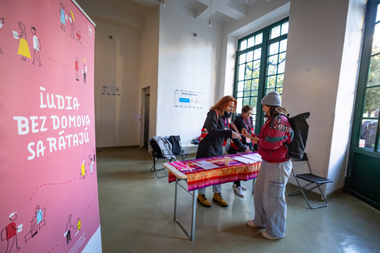 Atmosféra v organizačnej centrále v Starej Tržnici počas celomestského sčítania ľudí bez domova s názvom Ľudia bez domova sa rátajú. Foto: SITA/Jana Birošová.