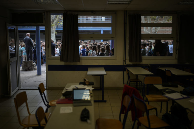 Pietna spomienka v škole v Marseille, ktorou si uctili pamiatku učiteľa, ten bol minulý týždeň dobodaný bývalým študentom. Foto: SITA/AP.