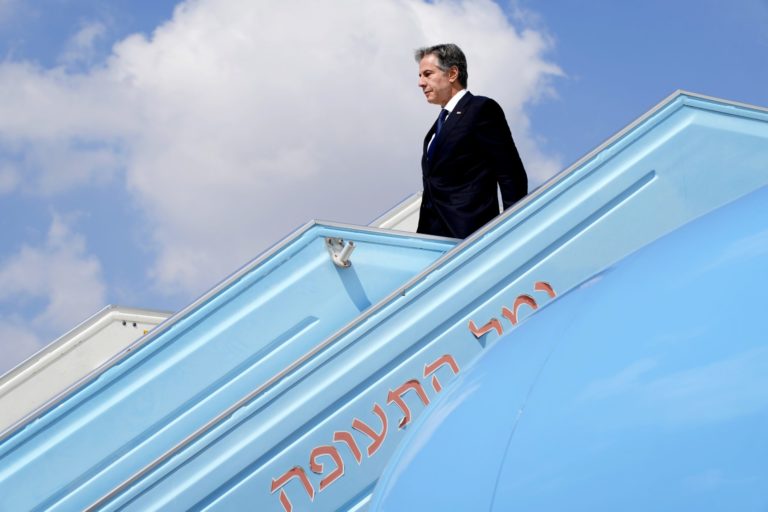 Americký minister zahraničných vecí Antony Blinken po prílete do Tel Avive, kam prišiel z Jordánska. Foto: SITA/AP.