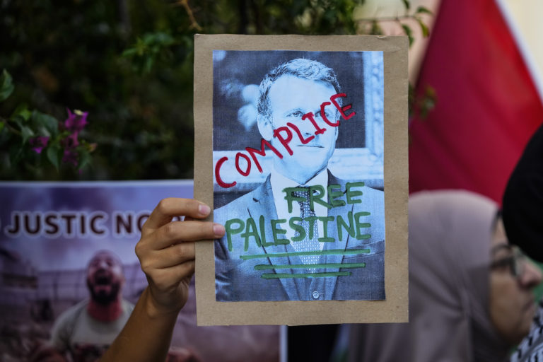 Palestínska dievčina drží portrét francúzskeho prezidenta Emmanuela Macrona s nápisom "spolupáchateľ" počas demonštrácie pred francúzskym veľvyslanectvom v Bejrúte. Foto: SITA/AP.