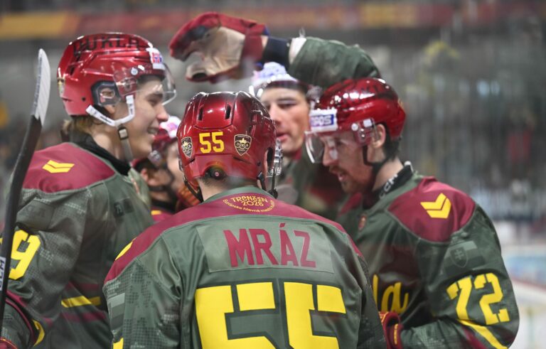 Hráči HK Dukla Trenčín sa radujú z gólu počas 39. kola Tipos extraligy 2024/2025 medzi HK Dukla Trenčín - HC Nové Zámky. Trenčín, 17. január 2025. Foto: SITA/Tomáš Somr