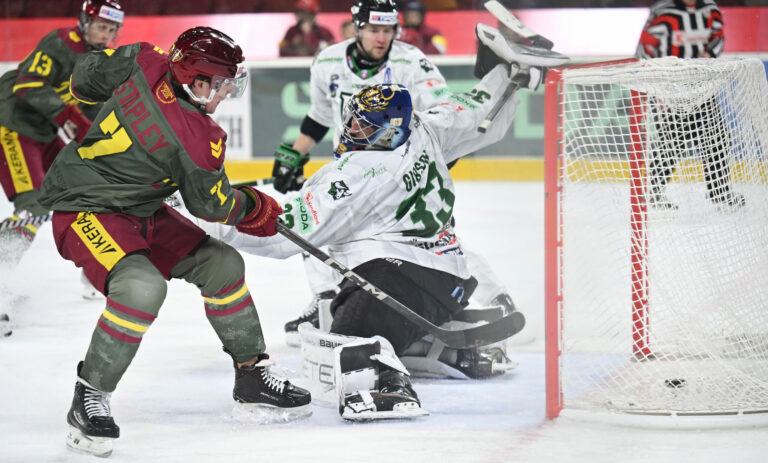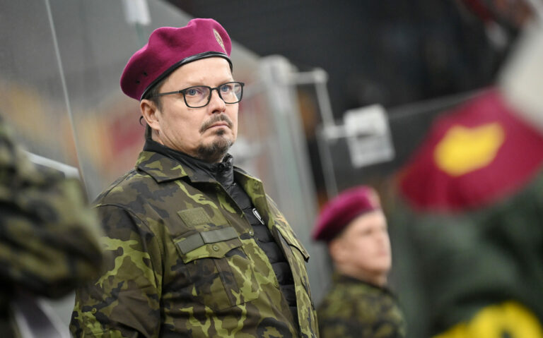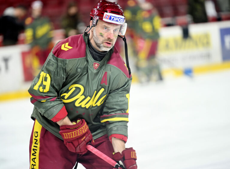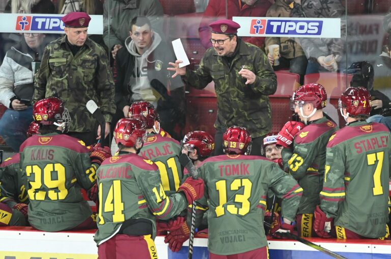 Tomáš Starosta z HK Dukla Trenčín v špeciálnom vojenskom drese počas zápasu 39. kola Tipos extraligy 2024/2025 medzi HK Dukla Trenčín - HC Nové Zámky. Trenčín, 17. január 2025. Foto: SITA/Tomáš Somr