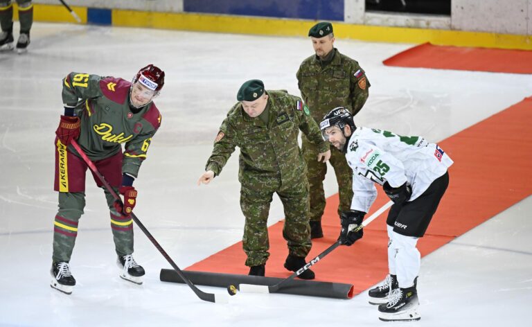 Zľava: Filip Ahl z HK Dukla Trenčín, brigádny generál Jozef Ševčík a Villiam Rapuzzi z HC Nové Zámky pred úvodným buly zápasu 39. kola Tipos extraligy 2024/2025 medzi HK Dukla Trenčín - HC Nové Zámky, ktoré sa nesie v duchu vojenských tradícii. Trenčín, 17. január 2025. Foto: SITA/Tomáš Somr