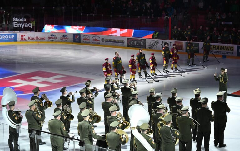 Štátnu hymnu Slovenskej republiky hrá Vojenská hudba Ozbrojených síl Slovenskej republiky na Zimnom štadióne Pavla Demitru v Trenčíne pred začiatkom zápasu 39. kola Tipos extraligy 2024/2025 medzi HK Dukla Trenčín - HC Nové Zámky, ktoré sa nesie v duchu vojenských tradícii. Trenčín, 17. január 2025. Foto: SITA/Tomáš Somr
