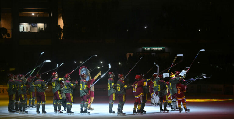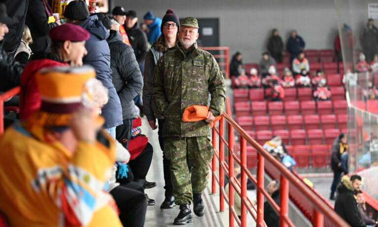 Atmosféra na Zimnom štadióne Pavla Demitru v Trenčíne po skončení zápasu 39. kola Tipos extraligy 2024/2025 medzi HK Dukla Trenčín - HC Nové Zámky, ktoré sa nesie v duchu vojenských tradícii. Trenčín, 17. január 2025. Foto: SITA/Tomáš Somr