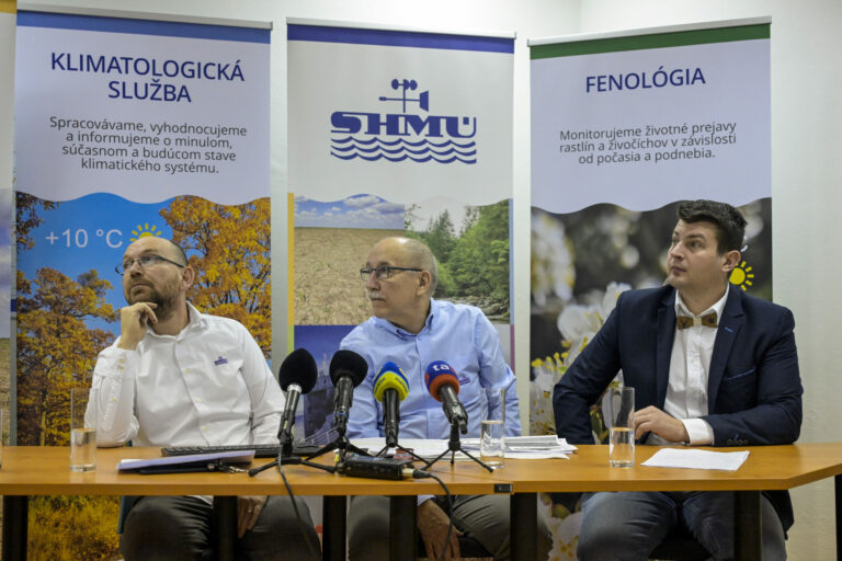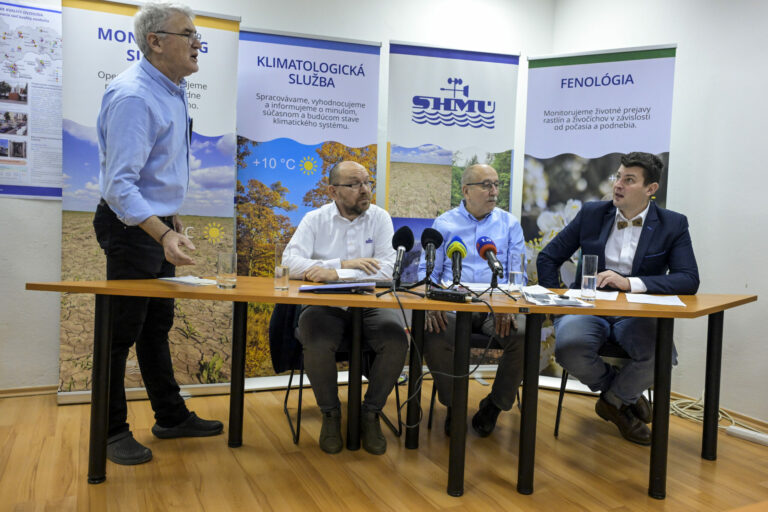 Zľava: Klimatológovia SHMÚ Peter Kajaba, Pavol Faško a Jozef Rozkošný počas tlačovej besedy Slovenského Hydrometeorologického Ústavu (SHMÚ) na tému: Klimatologické zhodnotenie roku 2024. Bratislava, 17. január 2025. Foto: SITA/Milan Illík