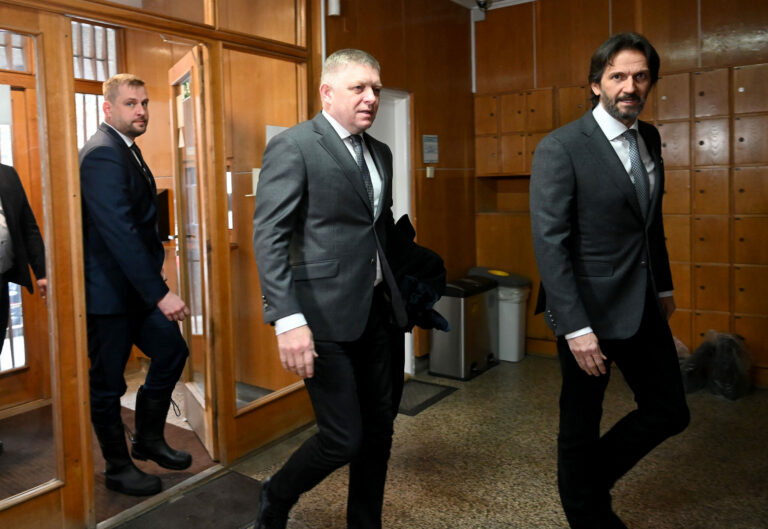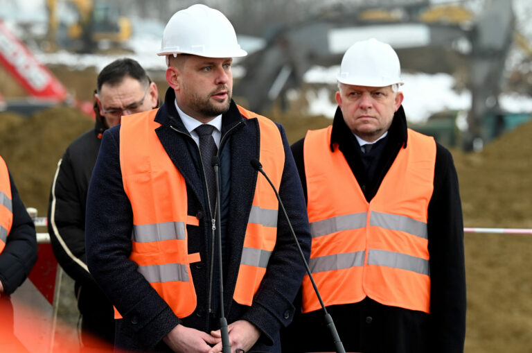 Minister zdravotníctva SR Kamil Šaško (vľavo v popredí) a predseda vlády SR Robert Fico (vpravo) počas tlačovej konferencie v areáli Fakultnej nemocnice J. A. Reimana v Prešove o výstavbe novej vojenskej nemocnice v Prešove v rámci regionálneho výjazdu predsedu vlády SR na východe Slovenska. Prešov, 17. január 2025. Foto: SITA/Viktor Zamborský