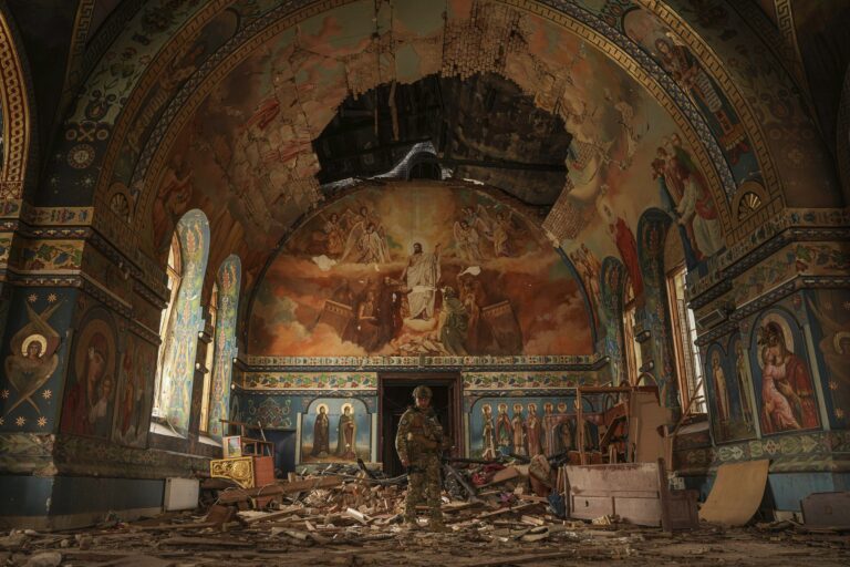 Ukrajinský vojak v pravoslávnom kostole ťažko poškodenom ruským bombardovaním. Novoekonomične, 17. september 2024. Foto: SITA/AP
