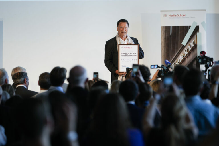 Bývalý kalifornský guvernér a herec Arnold Schwarzenegger s čestným doktorátom, ktorý mu udelila Hertie School v Nemecku. Berlín, 17. september 2024. Foto: SITA/AP