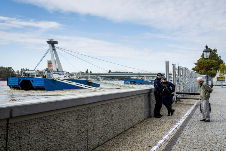 Starší muž sa rozpráva s policajtmi na brehu rozvodneného Dunaja. Bratislava, 17. september 2024. Foto: SITA/AP