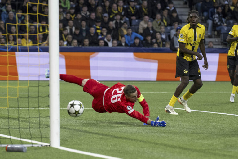 Brankár švajčiarskeho tímu Young Boys Bern David von Ballmoos inkasuje gól počas zápasu futbalovej Ligy majstrov proti anglickému tímu Aston Villa. Bern, 17. september 2024. Foto: Peter Schneider/Keystone via AP