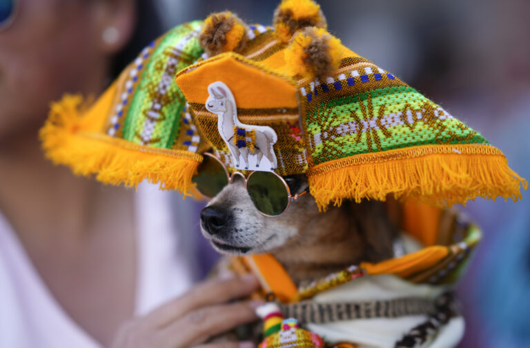 Pes v kostýme Llamerada súťaží počas osláv sviatku svätého Rocha, patróna psov, v La Paz v Bolívii. Foto: SITA/AP.