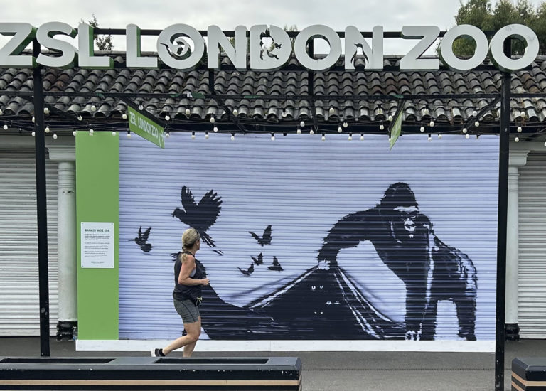 Bežkyňa sa pozerá na reprodukciu nástennej maľby Banksyho pred londýnskou zoologickou záhradou. Foto: SITA/AP.