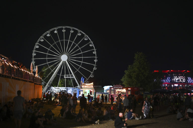 Pohľad na ruské koleso, na ktorom zhoreli dve kabínky počas festivalu v Nemecku. Foto: Heiko Rebsch/dpa via AP.