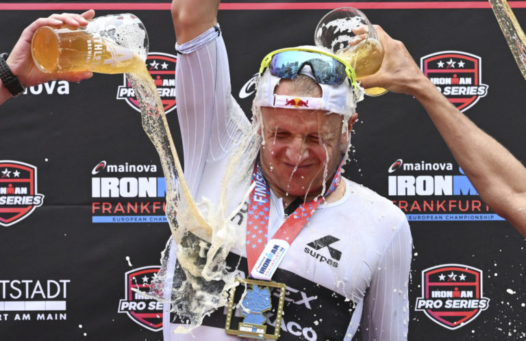 Nór Kristian Blummenfelt dostal pivnú sprchu na slávnostnom odovzdávaní cien, keď vyhral Majstrovstvá Európy v triatlone Ironman v nemeckom Frankfurte nad Mohanom. Foto: Arne Dedert/dpa via AP