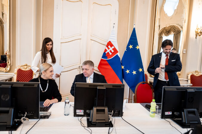 Zľava v popredí: Podpredsedníčka vlády a ministerka hospodárstva SR Denisa Saková, predseda vlády SR Robert Fico a podpredseda vlády SR a minister obrany SR Robert Kaliňák počas rokovania 128. schôdze vlády SR. Bratislava, 18. február 2026. Foto: SITA/Úrad vlády SR