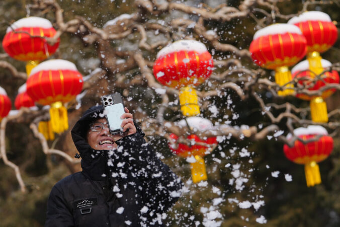 Muž si natáča sneh padajúci zo stromu ozdobeného lampiónmi v parku Ťing-šan (Jingshan Park) deň po snežení v Pekingu. Čína, 18. januára 2026. Foto: AP Photo/Andy Wong