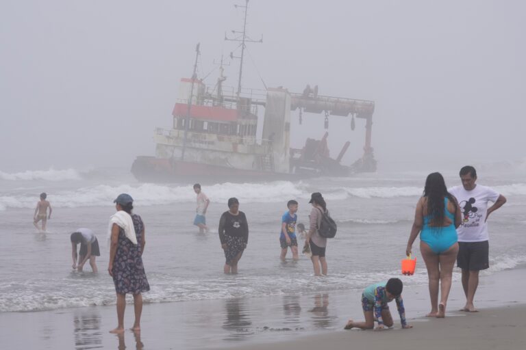 Návštevníci pláže oddychujú pred loďou Ghost Ship, ktorá uviazla vo vode, na pláži Costa Azul v meste Ventanilla. Peru, 18. januára 2026. Foto: AP Photo/Martin Mejia