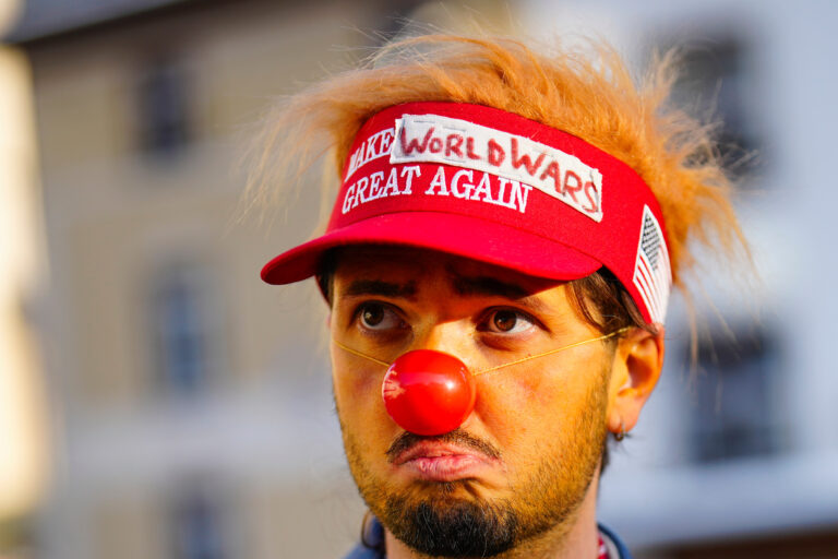 Muž oblečený ako klaun čaká na začiatok demonštrácie proti prezidentovi Trumpovi a Výročnému zasadaniu Svetového ekonomického fóra vo švajčiarskom Davose. Švajčiarsko, 18. januára 2026. Foto: AP Photo/Markus Schreiber