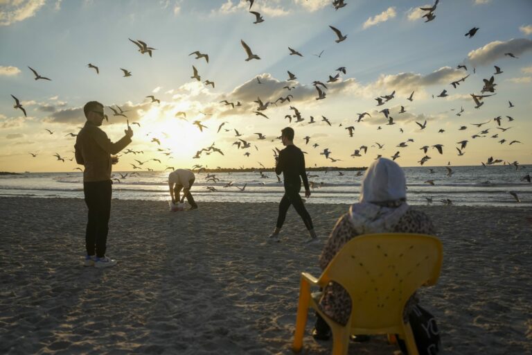 Ľudia sledujú západ slnka na pláži v izraelskom Tel Avive v sobotu 18. januára 2025. Foto: SITA/AP