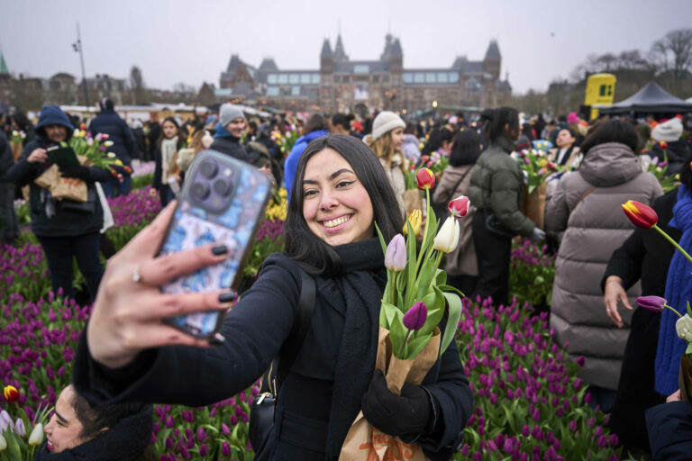 Tisíce ľudí si počas národného dňa tulipánov, ktorým sa otvára sezóna tulipánov v roku 2025, na Múzejnom námestí pred Rijksmuseum v Amsterdame v Holandsku v sobotu 18. januára 2025 vyberajú tulipány zadarmo. Foto: SITA/AP