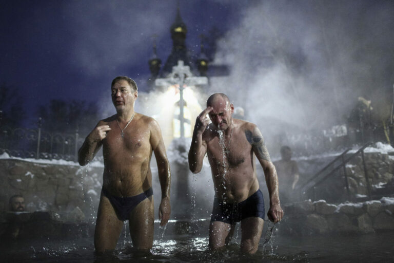 Ľudia sa ponárajú do ľadovej vody na oslavu pravoslávneho sviatku Bohozjavenia pri Ačarskom kláštore pri sibírskom meste Omsk, Rusko, sobota 18. januára 2025. Foto: SITA/AP