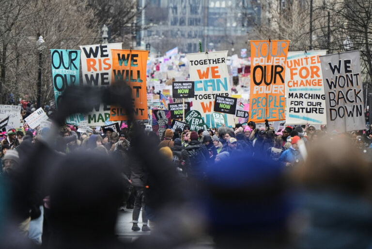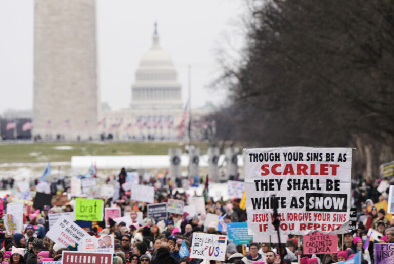 Ľudia pochodujú na Pochode ľudu v sobotu 18. januára 2025 vo Washingtone. Foto: SITA/AP