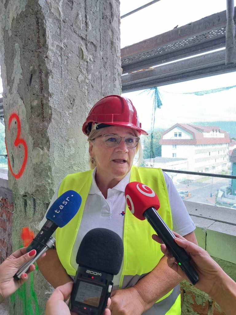 Riaditeľka technicko-prevádzkového úseku nemocnice v Poprade Alžbeta Pitoráková odpovedá na otázky novinárom počas prehliadky na stavenisku v rámci projektu Komplexná obnova a prestavba Nemocnice Poprad, na ktorý získala nemocnica 40 miliónov eur z Plánu obnovy a odolnosti. Poprad, 18. júl 2024. Foto: SITA/Mária Frisová