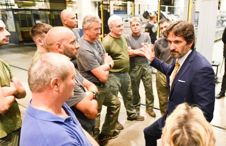 Minister obrany SR Robert Kaliňák (druhý zľava) a generálny riaditeľ ZTS - Špeciál Miroslav Sim (vpravo) počas tlačovej besedy pri novom stroji využívanom na výrobu hlavní pre delové systémy na tému: Modernizujeme obranný priemysel - budujeme sebestačné a úspešné Slovensko v Priemyselnom areáli Závodov ťažkého strojárstva (ZŤS) v Dubnici nad Váhom. Dubnica nad Váhom, 18. júl 2024. Foto: SITA/Martin Medňanský