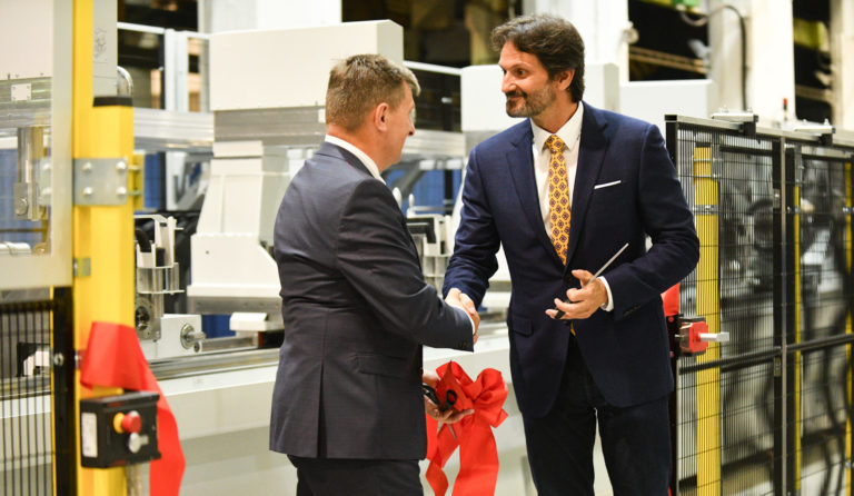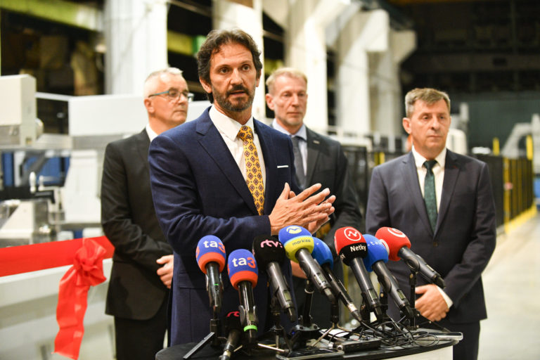 Sprava: Minister obrany SR Robert Kaliňák a generálny riaditeľ ZTS - Špeciál Miroslav Sim počas slávnostného prestrihnutia pásky pri novom stroji využívanom na výrobu hlavní pre delové systémy v rámci tlačovej besedy na tému: Modernizujeme obranný priemysel - budujeme sebestačné a úspešné Slovensko v Priemyselnom areáli Závodov ťažkého strojárstva (ZŤS) v Dubnici nad Váhom. Dubnica nad Váhom, 18. júl 2024. Foto: SITA/Martin Medňanský