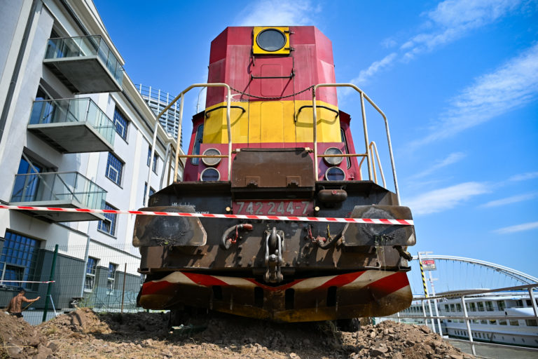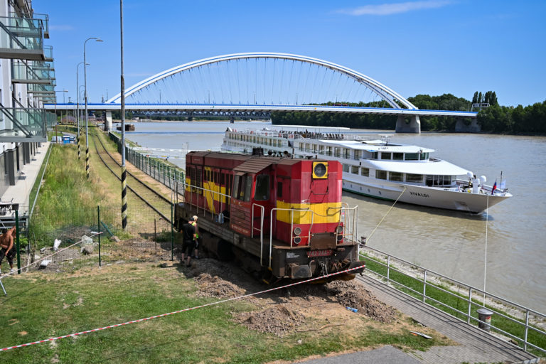 Vykoľajený nákladný vlak na nábreží Dunaja neďaleko obchodného centra Eurovea v Bratislave. Bratislava, 18. júl 2024. Foto: SITA