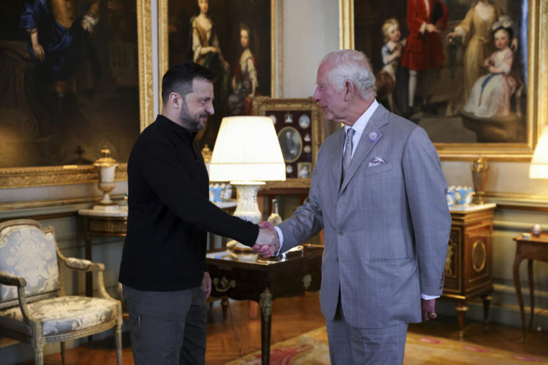 Britský kráľ Charles a ukrajinský prezident Volodymyr Zelenskyj počas stretnutia Európskeho politického spoločenstva, štvrtok 18. júla 2024. Foto: Hollie Adams/Pool via AP
