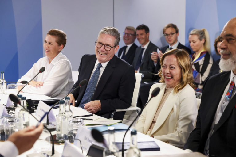 Zľava dánska premiérka Mette Frederiksen, britský premiér Keir Starmer, talianska premiérka Giorgia Meloni a albánsky premiér Edi Rama sa zúčastňujú pracovného stretnutia o migrácii počas stretnutia Európskeho politického spoločenstva v Blenheim Palace, vo Veľkej Británii, 18. jäl 2024. Foto: Hollie Adams/Pool Photo via AP