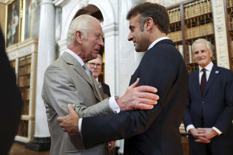 Britský kráľ Charles a francúzsky prezident Emmanuel Macron počas stretnutia Európskeho politického spoločenstva, štvrtok 18. júla 2024. Foto: Hollie Adams/Pool via AP