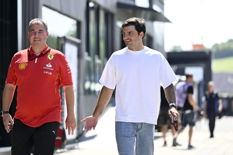 Španielsky pilot Formuly 1 Carlos Sainz (vpravo) z Ferrari prichádza do paddocku pred Veľkou cenou Maďarska Formuly 1. Veľká cena Maďarska F1 sa koná Nedeľa 21. júla 2024. Foto: SITA/AP