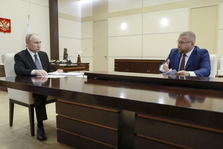 Ruský prezident Vladimir Putin a šéf ruskej federálnej colnej služby Valerija Pikaleva počas ich stretnutia v štátnej rezidencii Novo-Ogaryovo pri Moskve v Rusku, štvrtok 18. júla 2024. Foto: Vyacheslav Prokofyev, Sputnik, Kremlin Pool Photo via AP