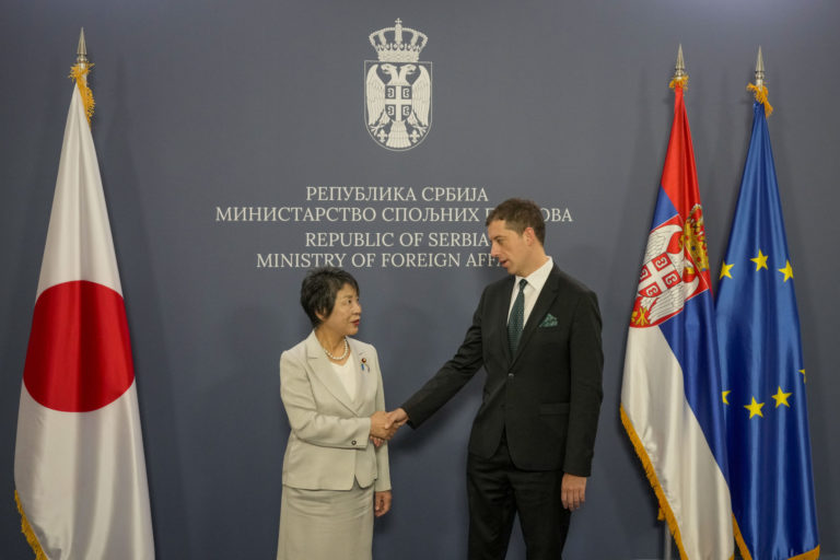Srbský minister zahraničných vecí Marko Djuric s japonskou ministerkou zahraničných vecí Yoko Kamikawou v Belehrade, Srbsko, štvrtok 18. júla 2024. Kamikawa je na jednodňovej návšteve Srbska. FOTO: SITA/AP