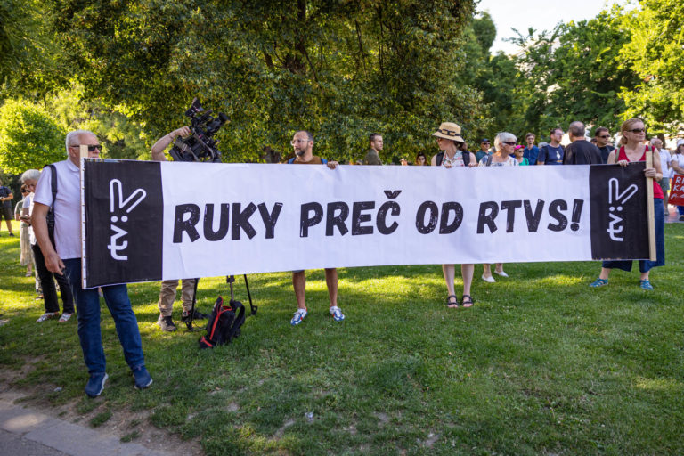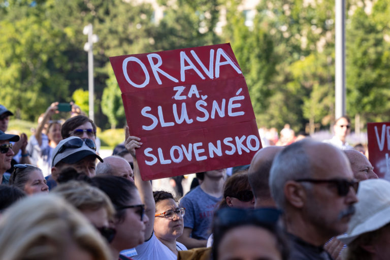 Účastníci počas občianskeho pochodu Za slobodu! Za demokraciu! na Námestí slobody v Bratislave. Bratislava, 18. jún 2024. Foto: SITA/Jana Birošová