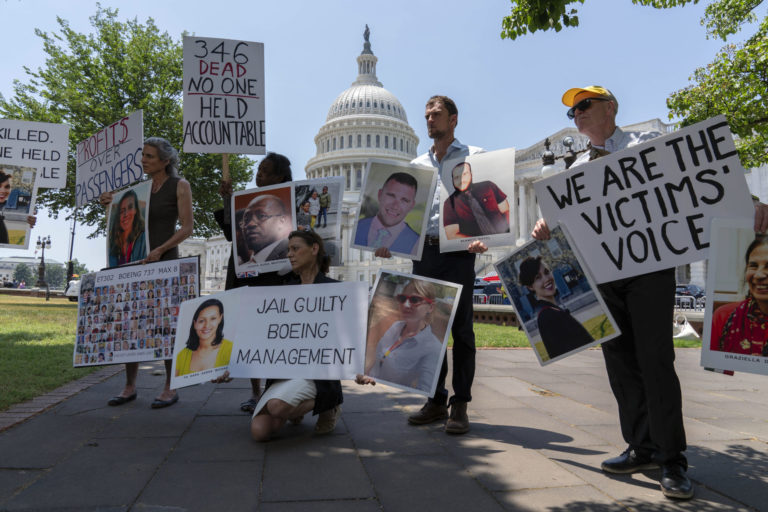 Rodinní príslušníci obetí havárie Boeingu 737 MAX8 v Etiópii protestujú počas tlačovej konferencie, 18. jún 2024. Foto: SITA/AP