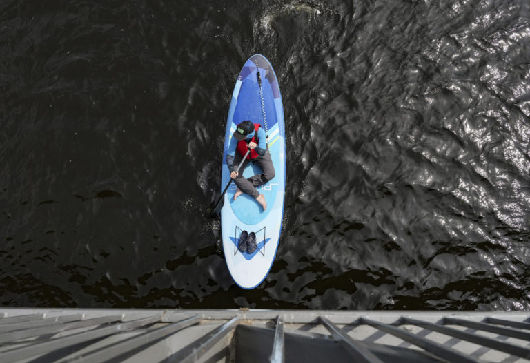 Osoba používa paddleboard na kanáli Lachine v Montreali, 18. jún 2024. Foto: Christinne Muschi/The Canadian Press via AP