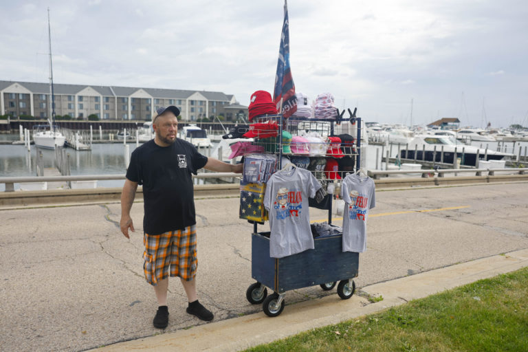 Muž predáva oblečenie s motívom Donalda Trumpa na mieste predvolebného podujatia, 18. jún 2024. Foto:SITA/AP