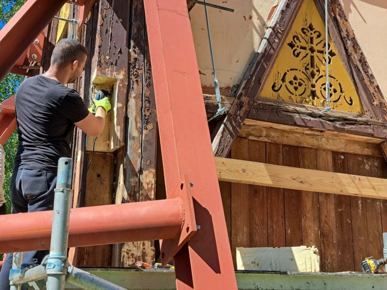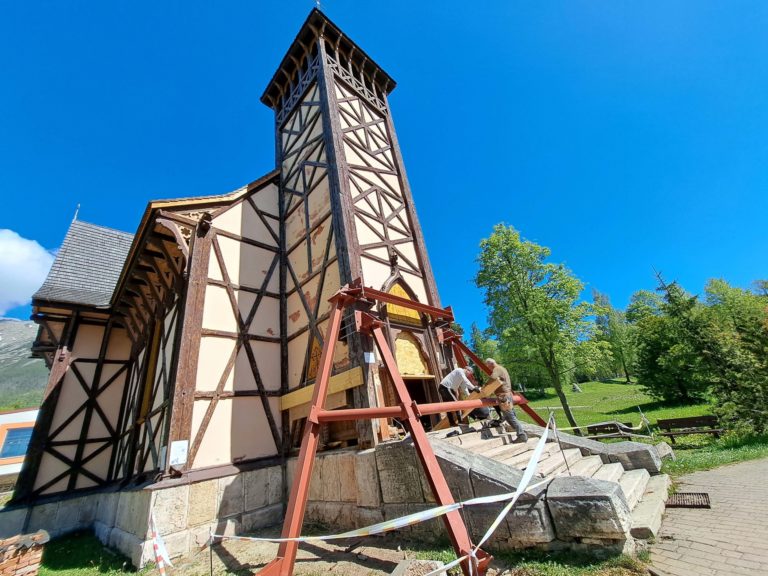 Výmena stĺpov konštrukcie veže Kostola Nepoškvrneného počatia Panny Márie v Starom Smokovci vo Vysokých Tatrách poškodených hnilobou v rámci jej záchrany. Starý Smokovec, 15. máj 2024. Foto: SITA/Mária Frisová