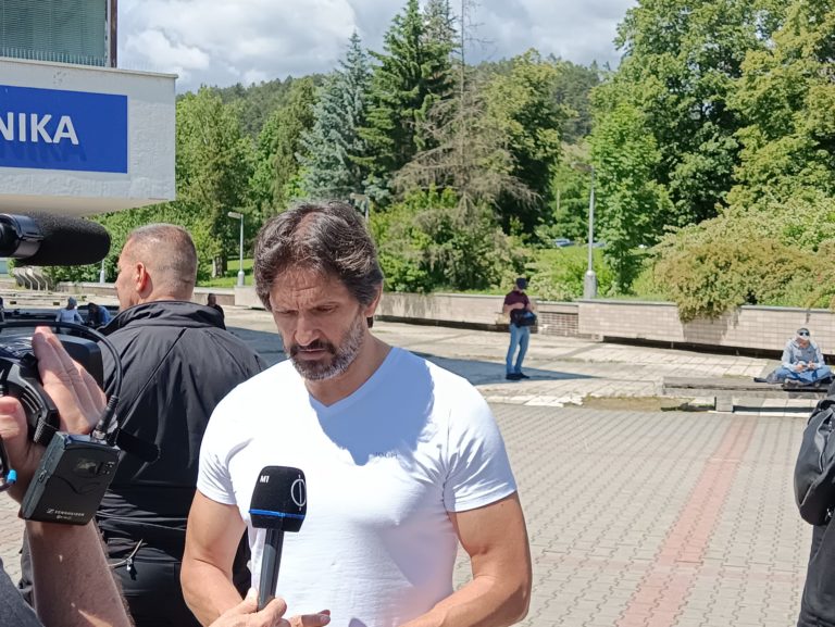 Minister obrany SR Robert Kaliňák (vpravo) počas tlačového brífingu pred Fakultnou nemocnicou s poliklinikou F. D. Roosevelta Banská Bystrica ku zdravotnému stavu premiéra SR Roberta Fica po postrelení na výjazdovom rokovaní vlády SR v Handlovej. Banská Bystrica, 18. máj 2024. Foto: SITA/Milan Šoka