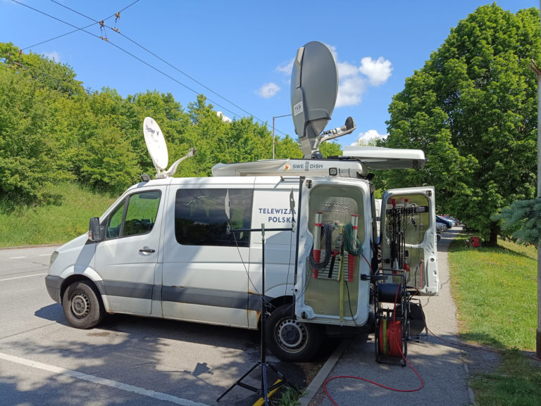 Vozidlo verejnoprávnej televíznej spoločnosti v Poľsku Telewizja Polska pred Fakultnou nemocnicou s poliklinikou F. D. Roosevelta Banská Bystrica, kde leží premiér SR Robert Fico po postrelení na výjazdovom rokovaní vlády SR v Handlovej. Banská Bystrica, 18. máj 2024. Foto: SITA/Milan Šoka