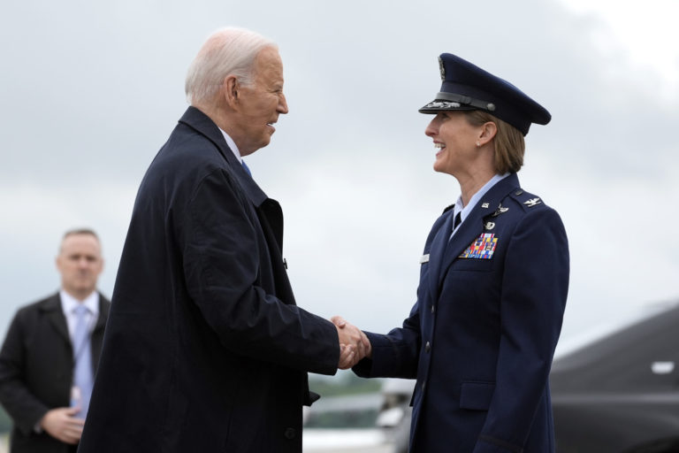 Prezidenta Joea Bidena (vľavo) víta plukovníčka letectva Angela Ochoaová, veliteľka 89. leteckého krídla. Foto: SITA/AP
